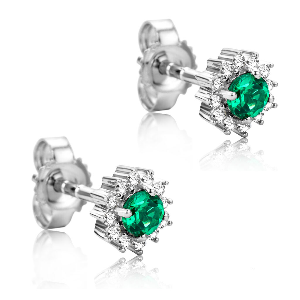 Earrings 9KT (375) White Gold Created Emeralds and Diamonds.